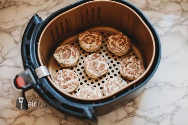 For my FrenchMay air fryer, I find that it takes around 15 minutes at 340°F | 171°C, flipping once. However, my Chefman is a little different. I bake the cinnamon rolls at 360°F | 183°C for 12 minutes, flipping halfway. So if it’s the first time you’ve tried cinnamon rolls in the air fryer, be sure to check them often and make needed adjustments.